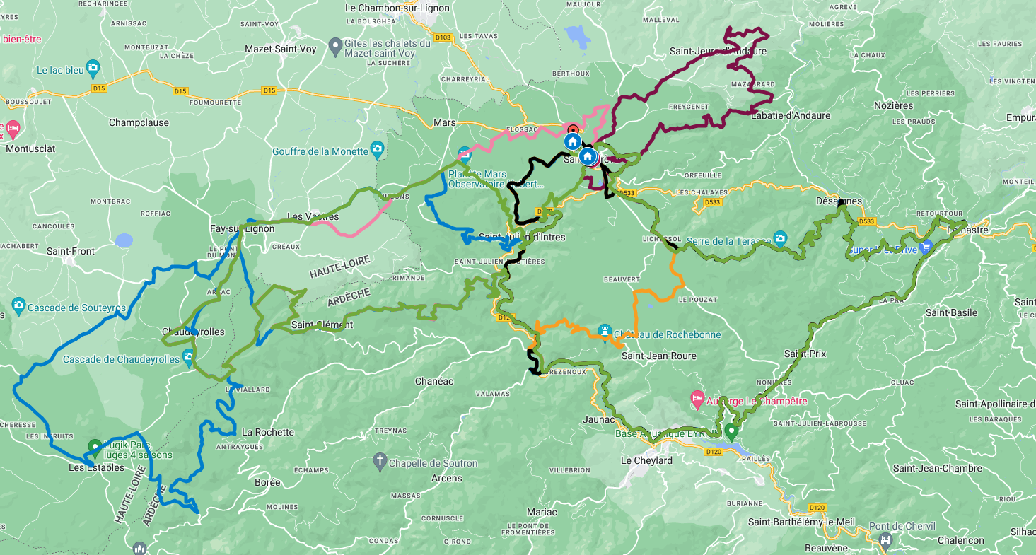- Tour 4 -> La source de l'Eyrieux, trace couleur rose, 123,5 km - 2368 m d+ Télécharger le parcours